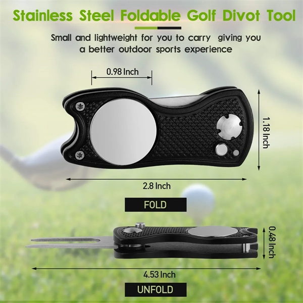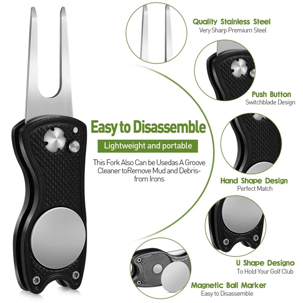 Leave the golf course looking as pristine after your round as when you arrived with this divot fixer tool and ball marker. Made of stainless steel, this 4.72″ x 1.18″ x 0.59″ device has switchblade action that releases two prongs to replace divots and earth. Folds down to 2.76″ x 1.18″ x 0.59″ to fit in a pocket. The detachable marker helps keep track of your ball on the green. Makes a great gift from a favorite golf course, country club or pro shop. Available in assorted colors. Add your organizational or company logo or message to customize.