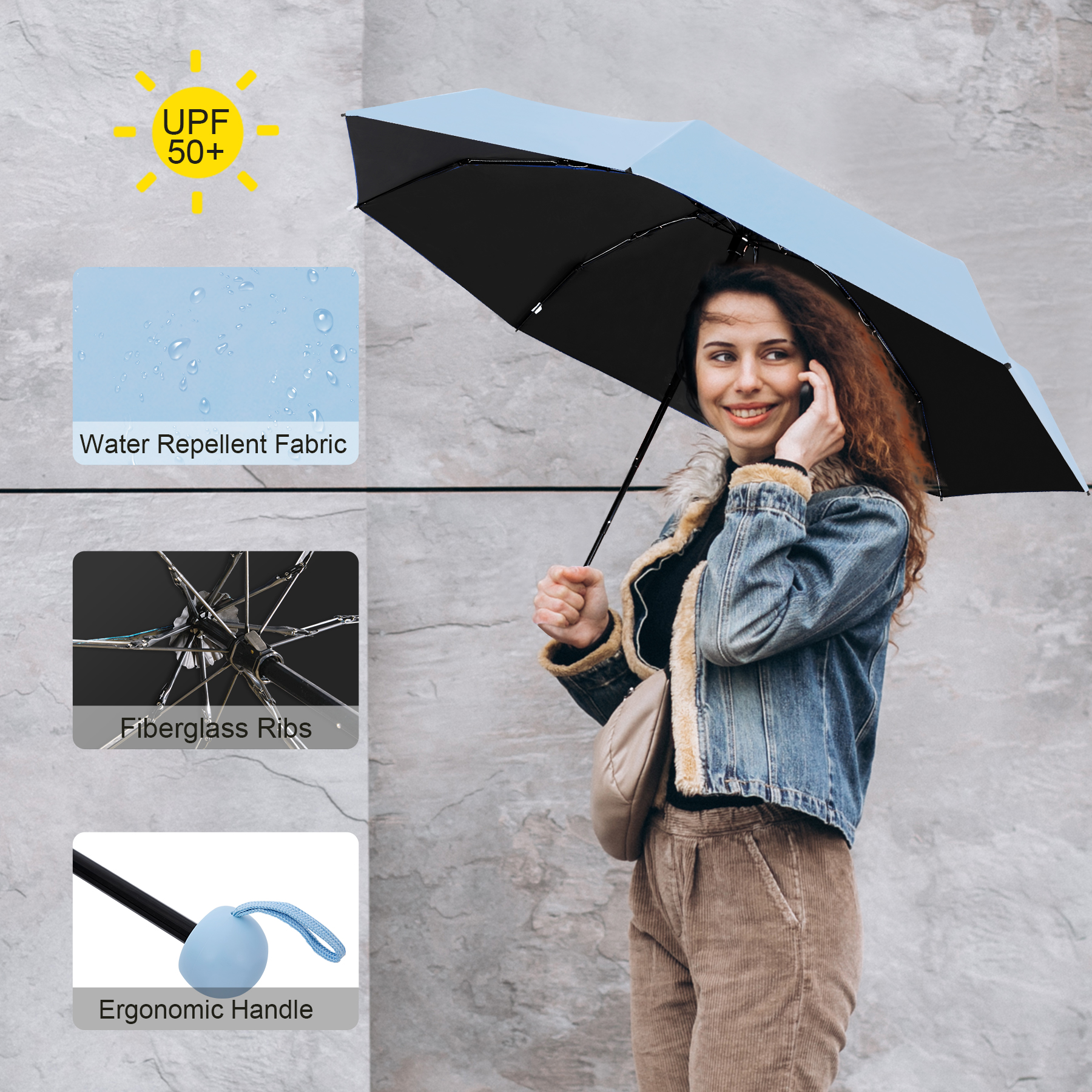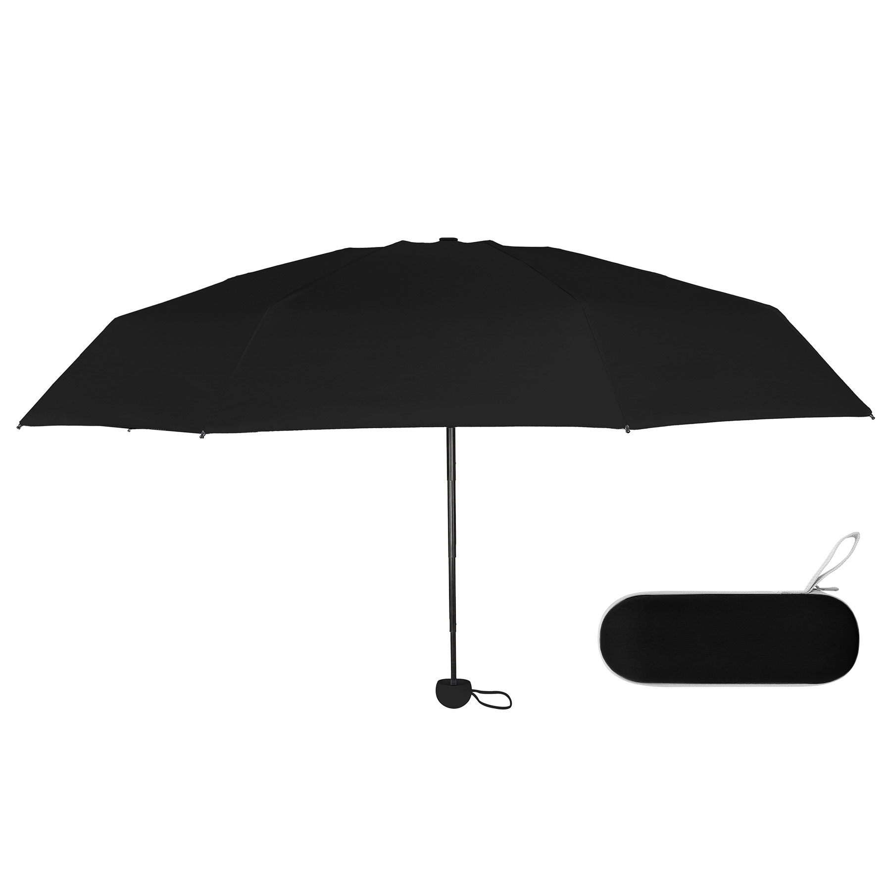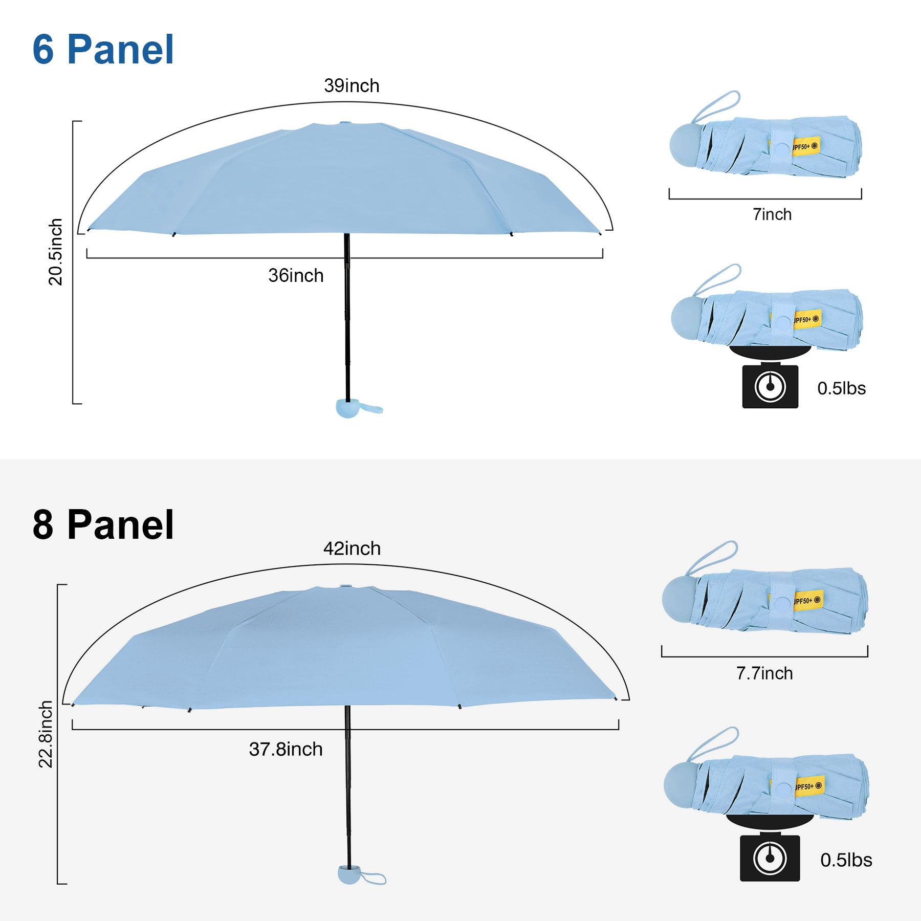 Crafted with anti-rust fiberglass ribs and a sturdy metal shaft, this mini travel umbrella is built to withstand the elements while maintaining a sleek, portable design. Its UPF 50+ UV-protective coating blocks 99% of harmful rays, ensuring safe shade on sunny days, and the included waterproof EVA storage case adds convenience for travel and daily commutes. With the option to imprint logos, slogans, or artwork on both the canopy and case, it serves as an ideal promotional gift for corporate events, trade shows, client giveaways, and loyalty programs. Available in two versatile sizes—a compact 39" arc (6-panel) and a spacious 42" arc (8-panel)—it caters to different coverage needs.